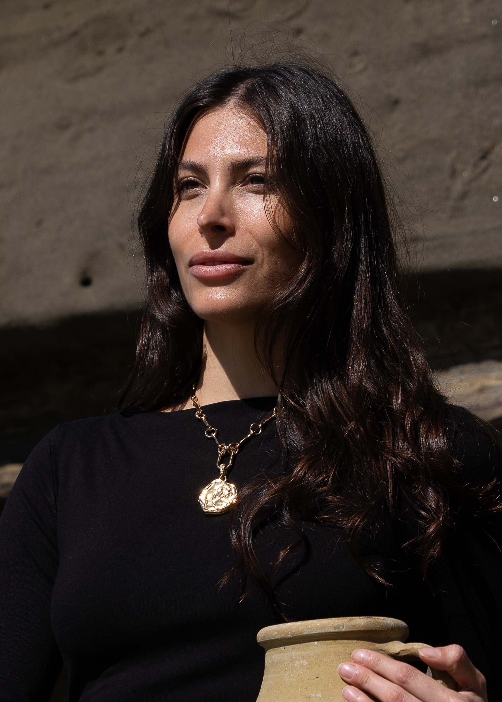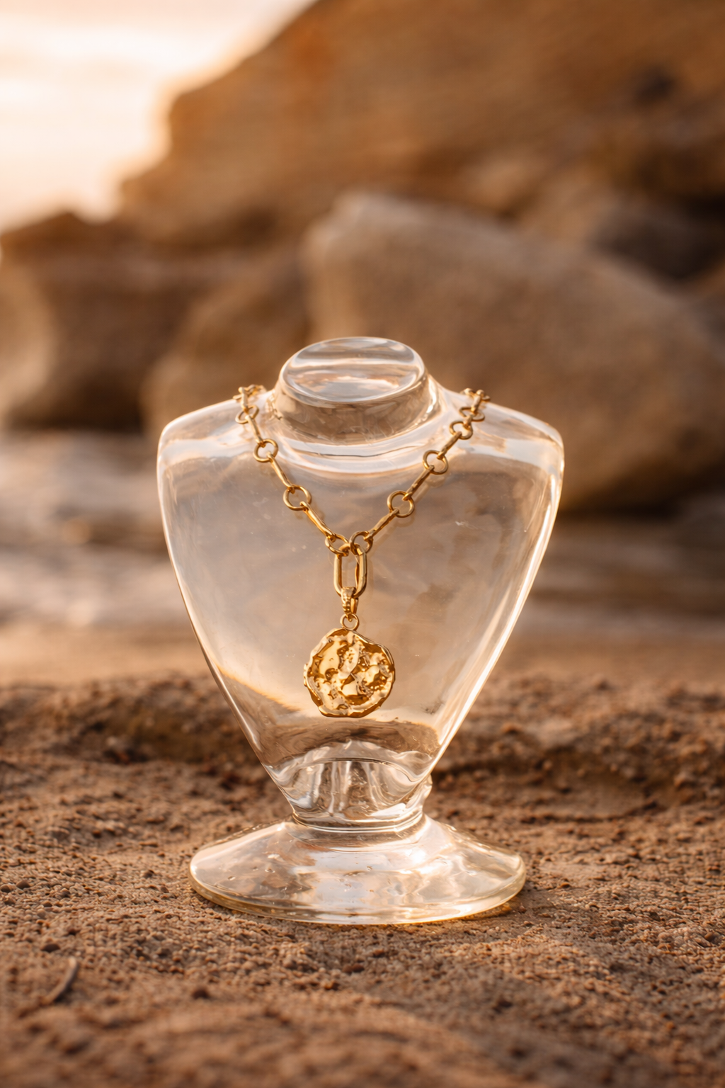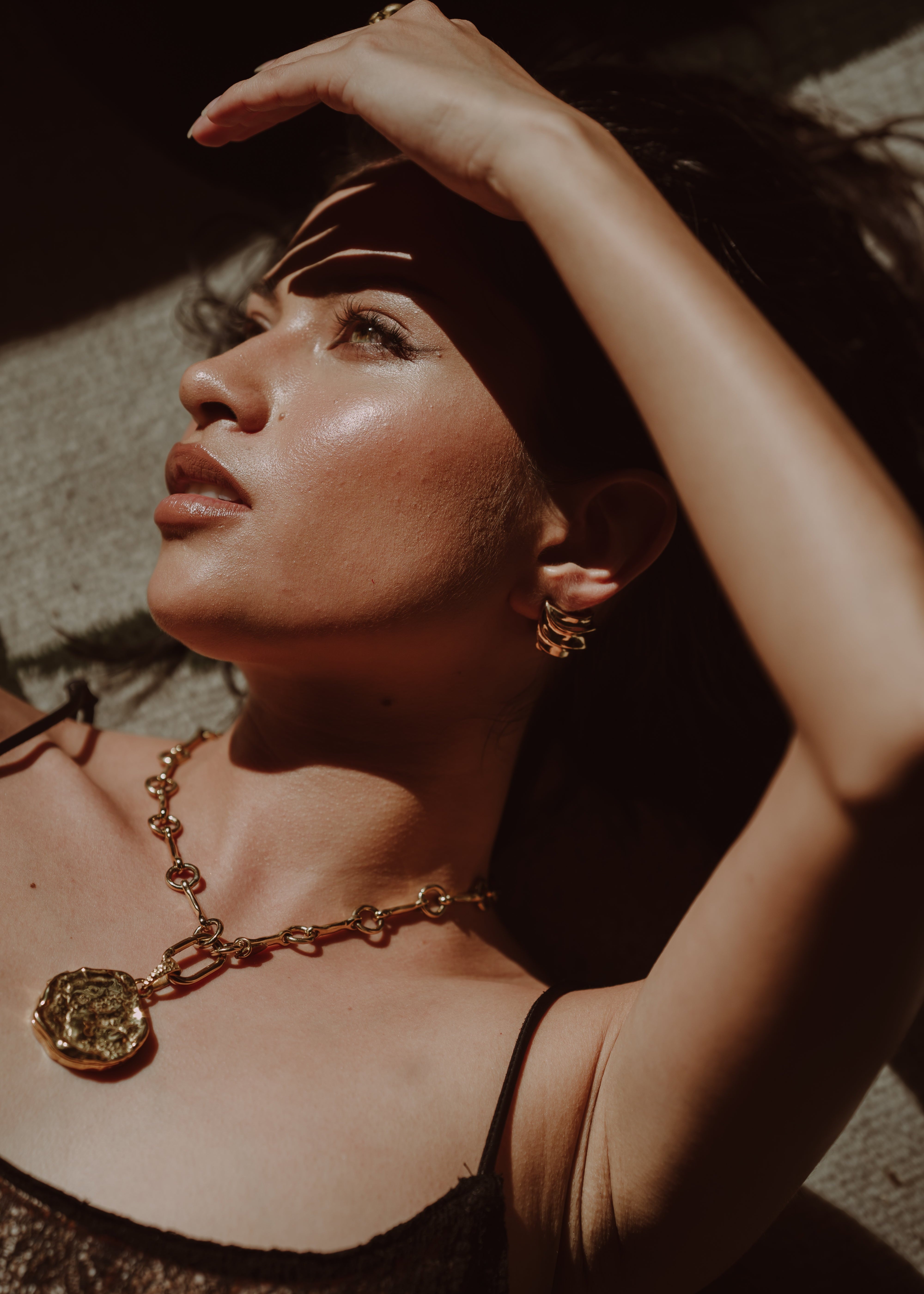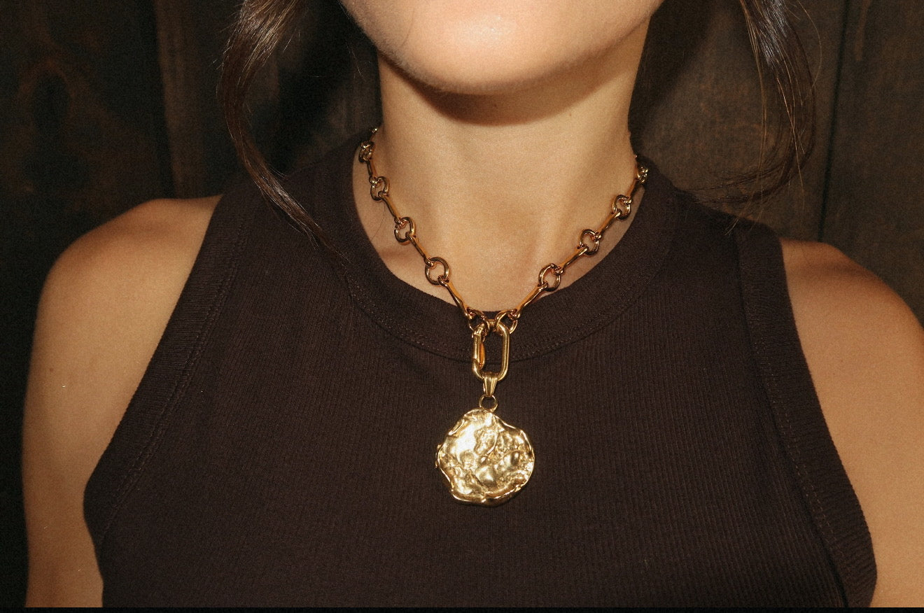 A bold yet effortless statement, the Zahara necklace features a chunky gold chain paired with an organic-shaped gold coin. Inspired by the sunlit shores of Spain, its fluid form captures the beauty of natural imperfections. Timeless, radiant, and designed to stand out.