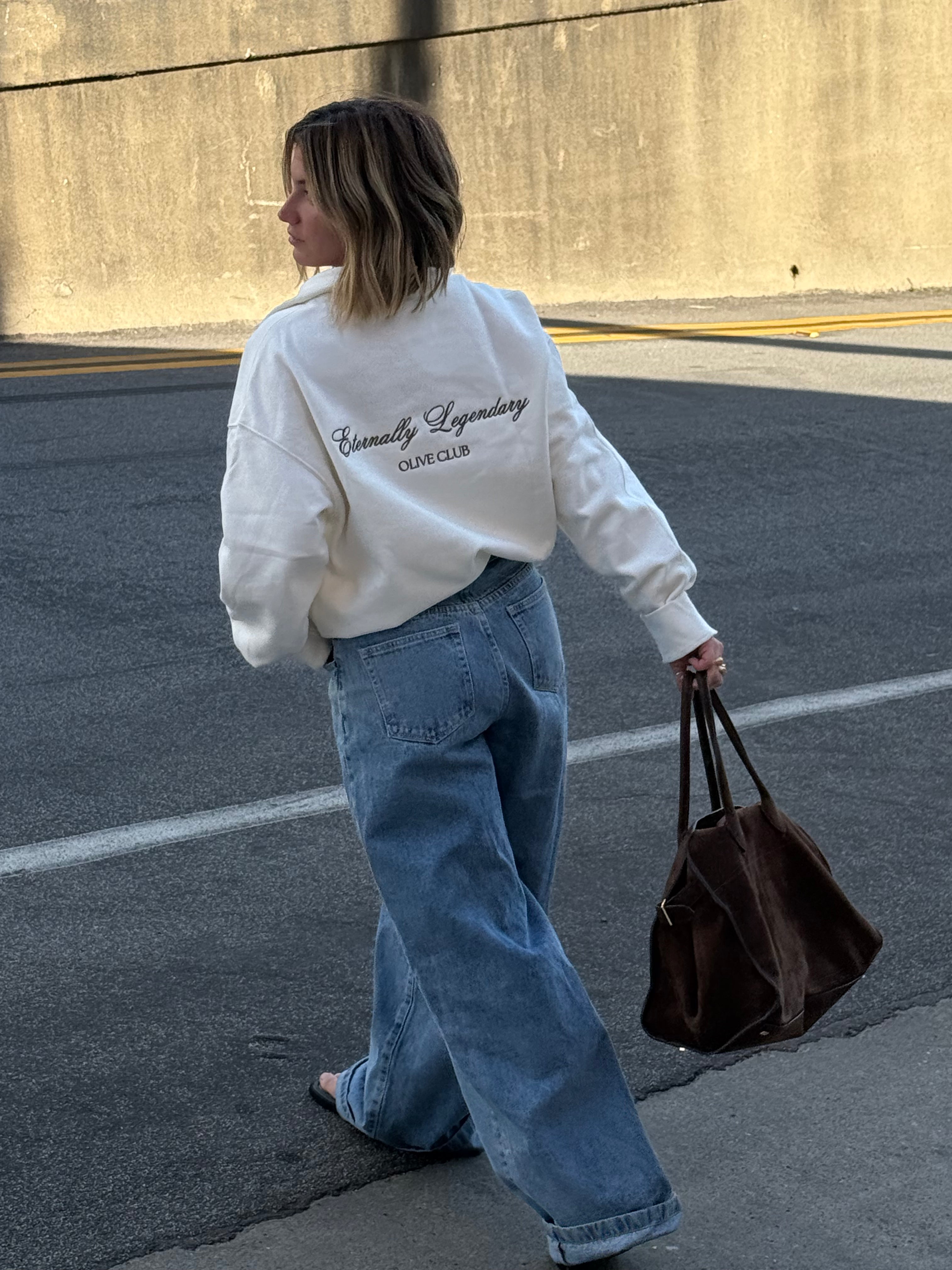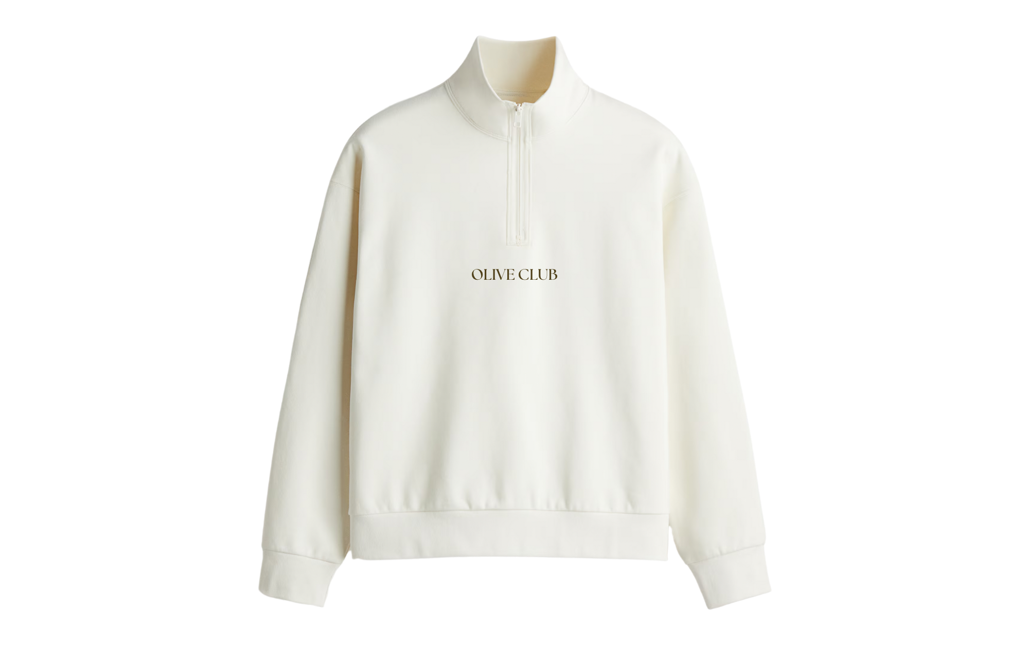 A loose-fit hoodie crafted from heavyweight fabric with a soft, brushed interior for extra comfort. Designed in a creamy white shade with bold brown lettering. It features a stand-up collar with a half-zip, dropped shoulders, and long sleeves for a relaxed yet refined feel.